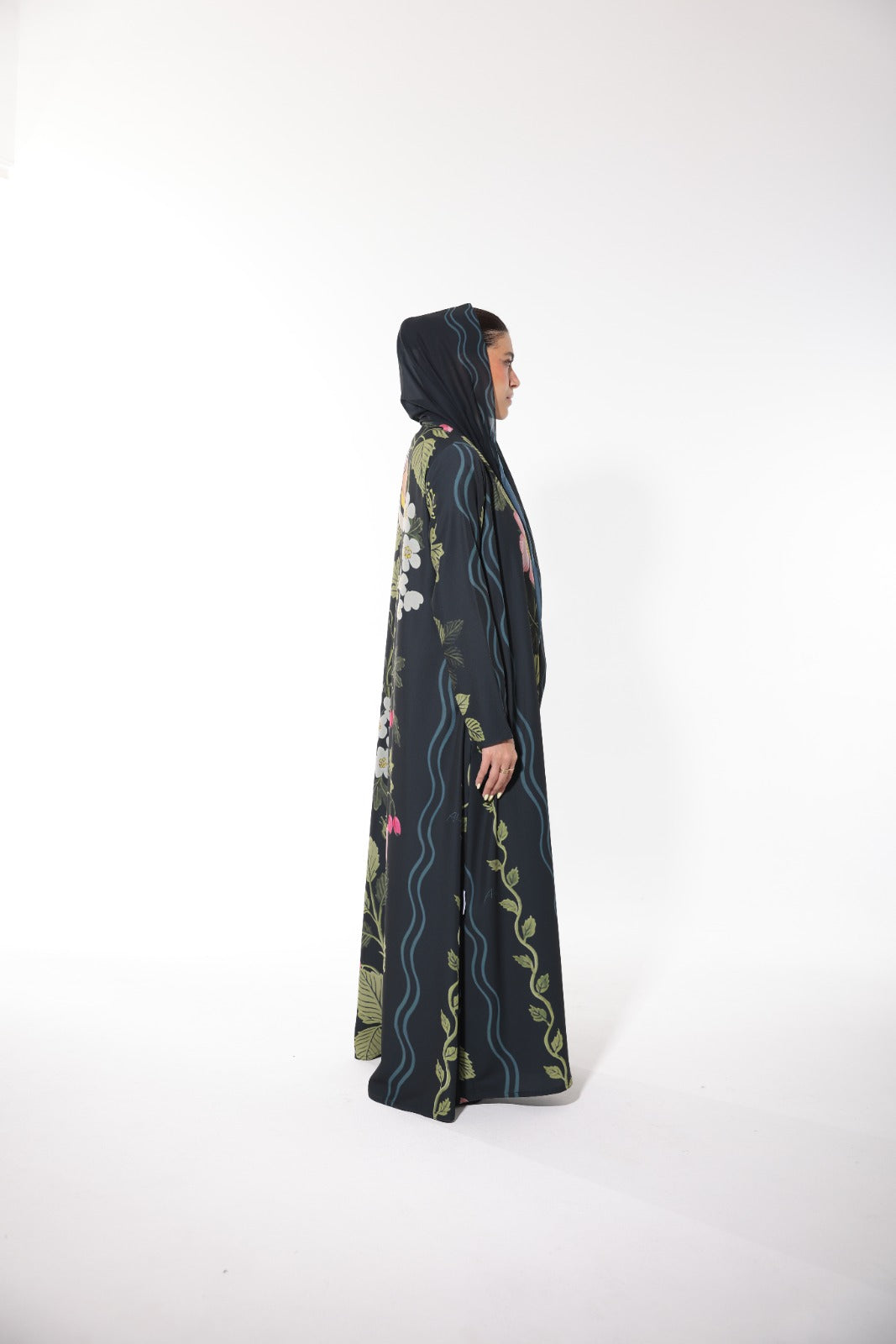 Step into elegance with our Botanical Harmony Abaya crafted from crepe fabric for a lightweight, flowing silhouette that moves with grace. This unique piece features a nature-inspired print with blooming florals, leafy vines, and a beautifully detailed bird motif on the back a tribute to the beauty of the natural world.