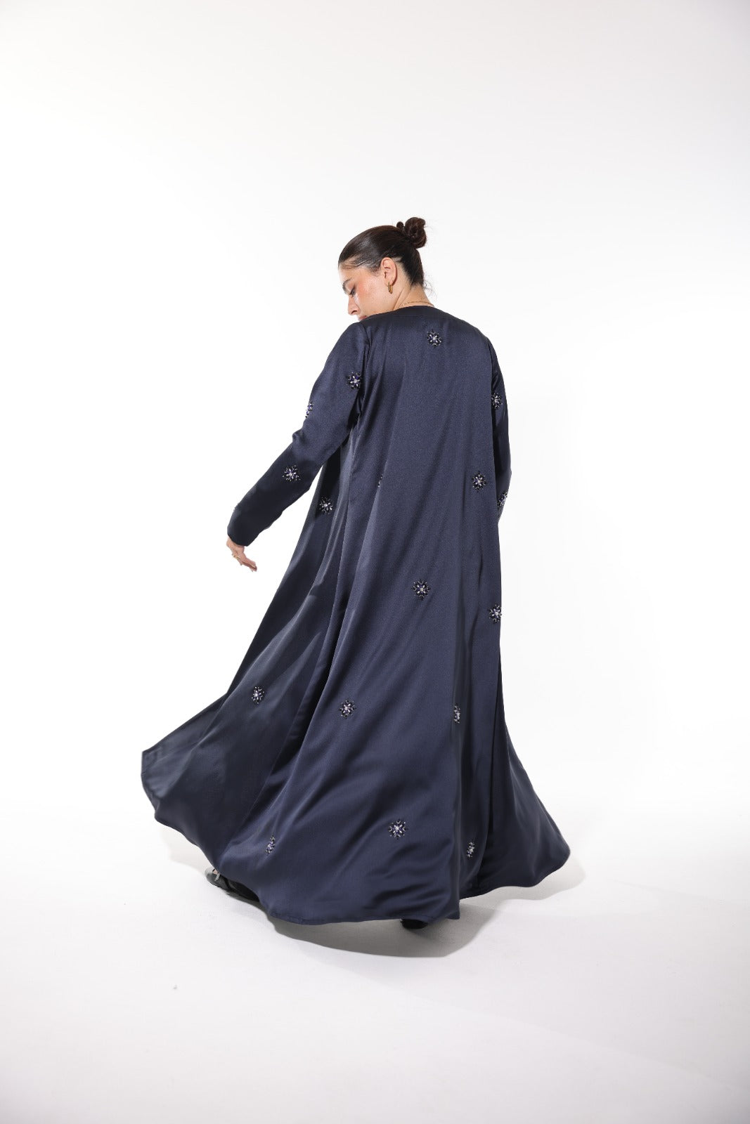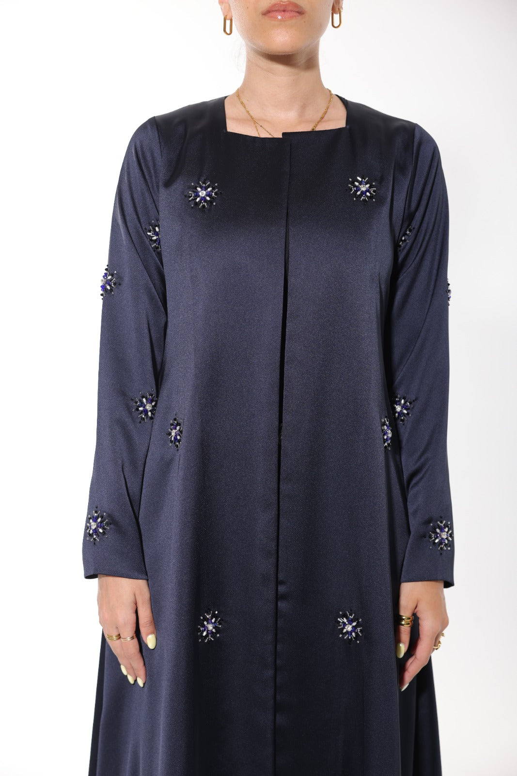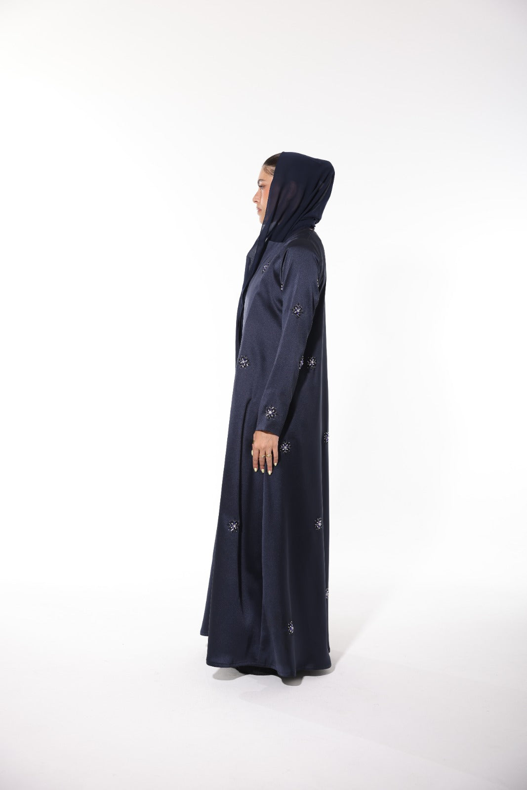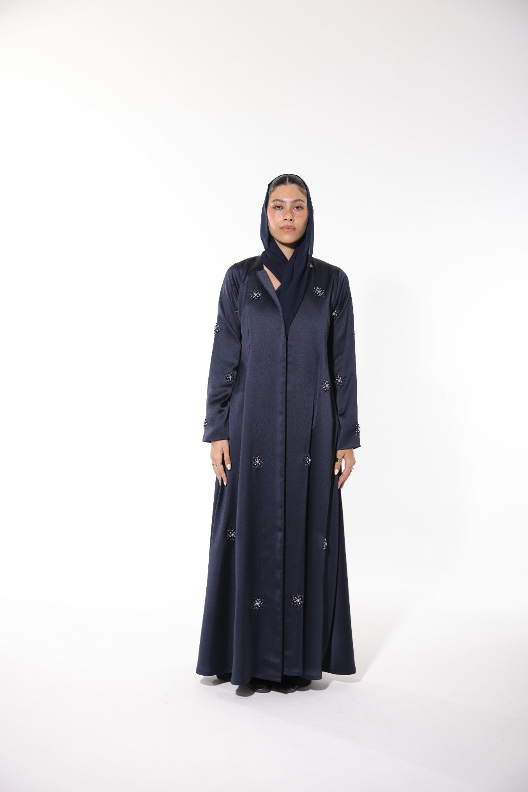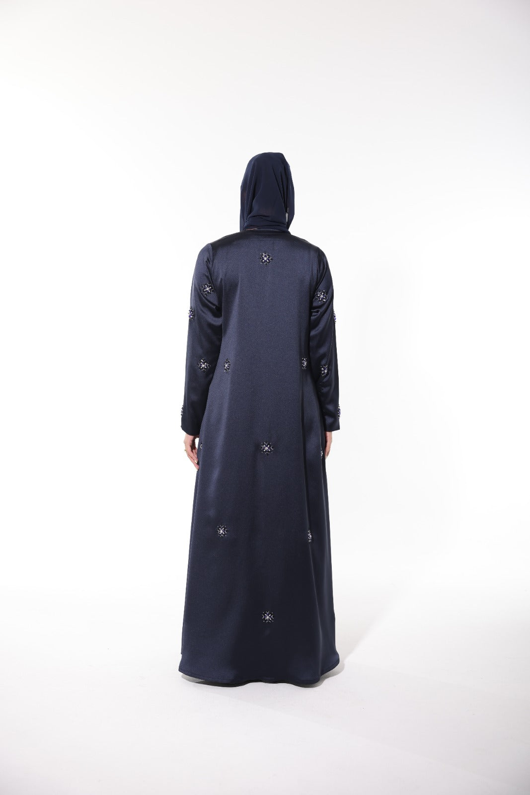 Elegant dark blue abaya crafted from Italian silk, featuring delicate embroidery embellishments. This stunning piece is perfect for making a statement.