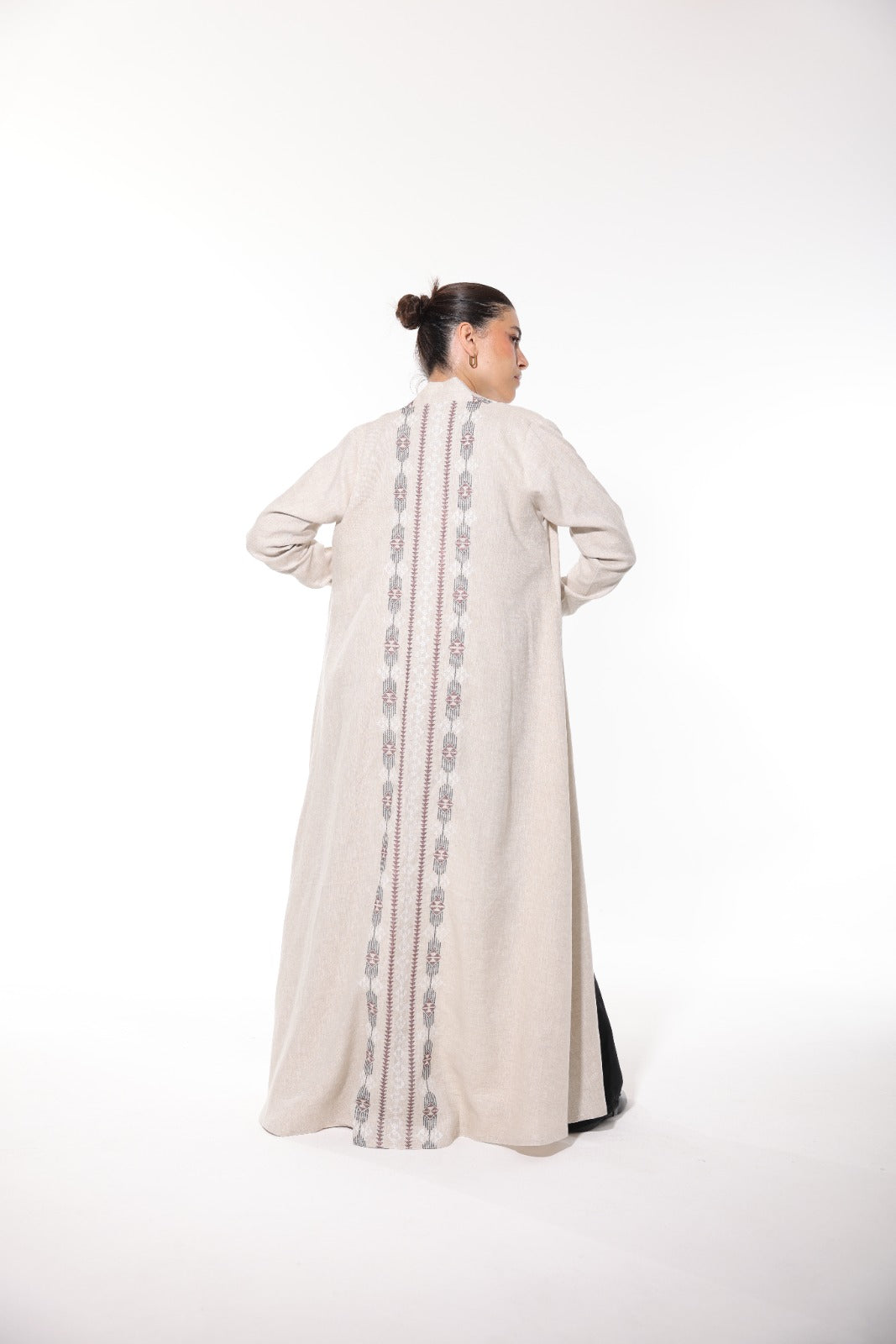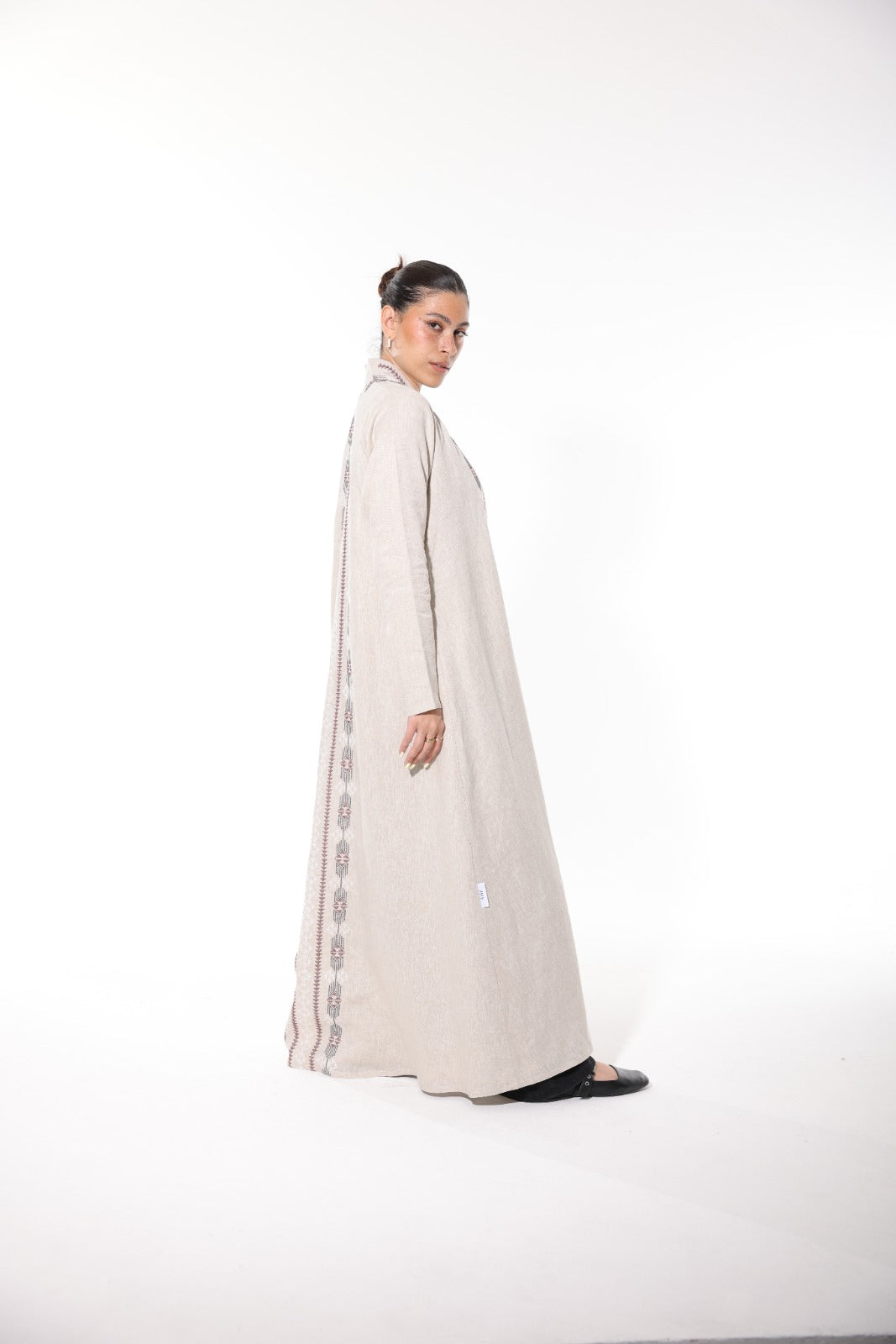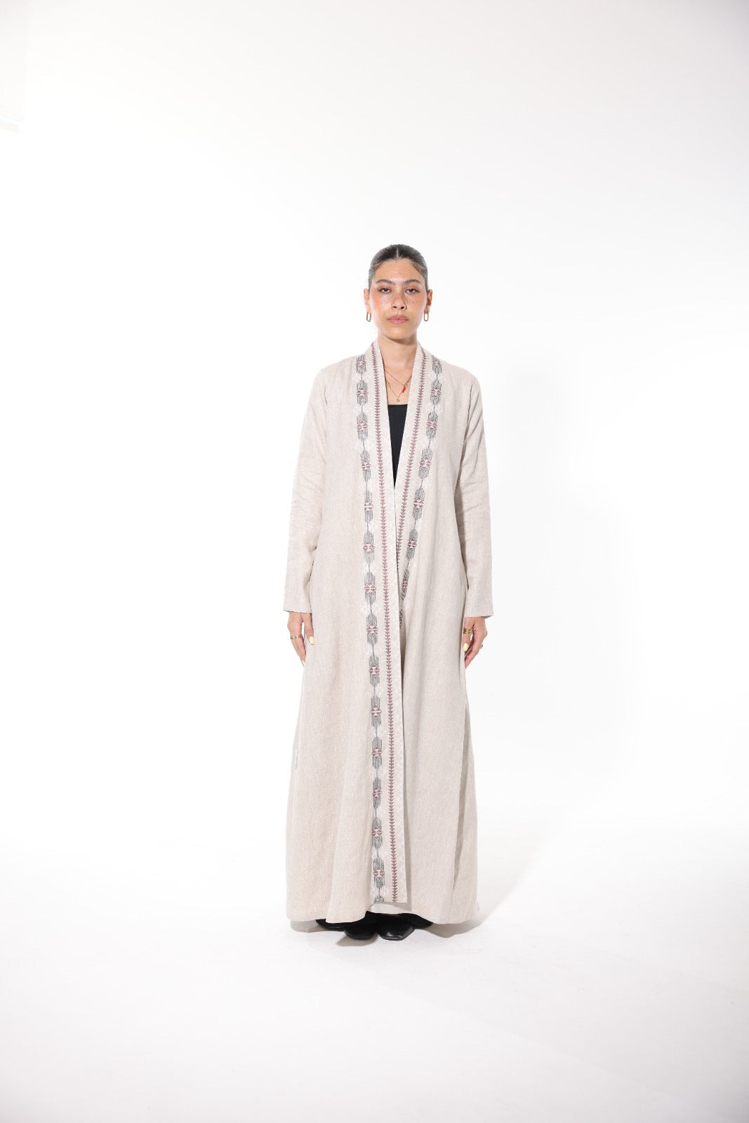 Rimal is inspired by the soft elegance of desert sands, it is a beige linen abaya that speaks of natural grace and subtle sophistication. The breathable fabric flows effortlessly, making it a perfect choice for both everyday wear and refined occasions. A standout embroidered panel runs vertically down the back, combining shades of grey and muted rose in a traditional yet modern design. Lightweight, timeless, and detailed with care — Rimal is where simplicity meets art.