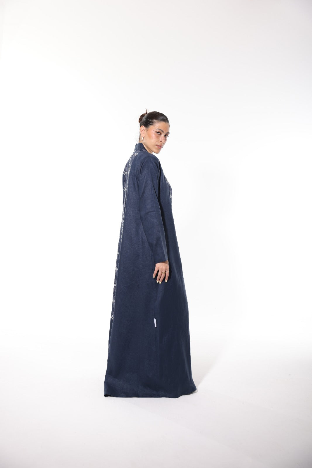 Introducing Lailah, a striking navy blue linen abaya that captures the quiet beauty of a starlit night. Designed in breathable, flowy linen, this piece features elegant embroidery in geometric patterns that cascade gracefully down the back and sleeves. Lailah blends tradition with bold sophistication, turning every movement into a statement.