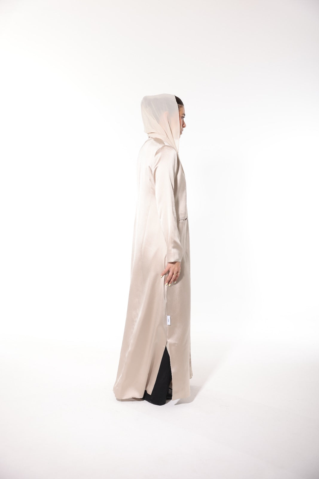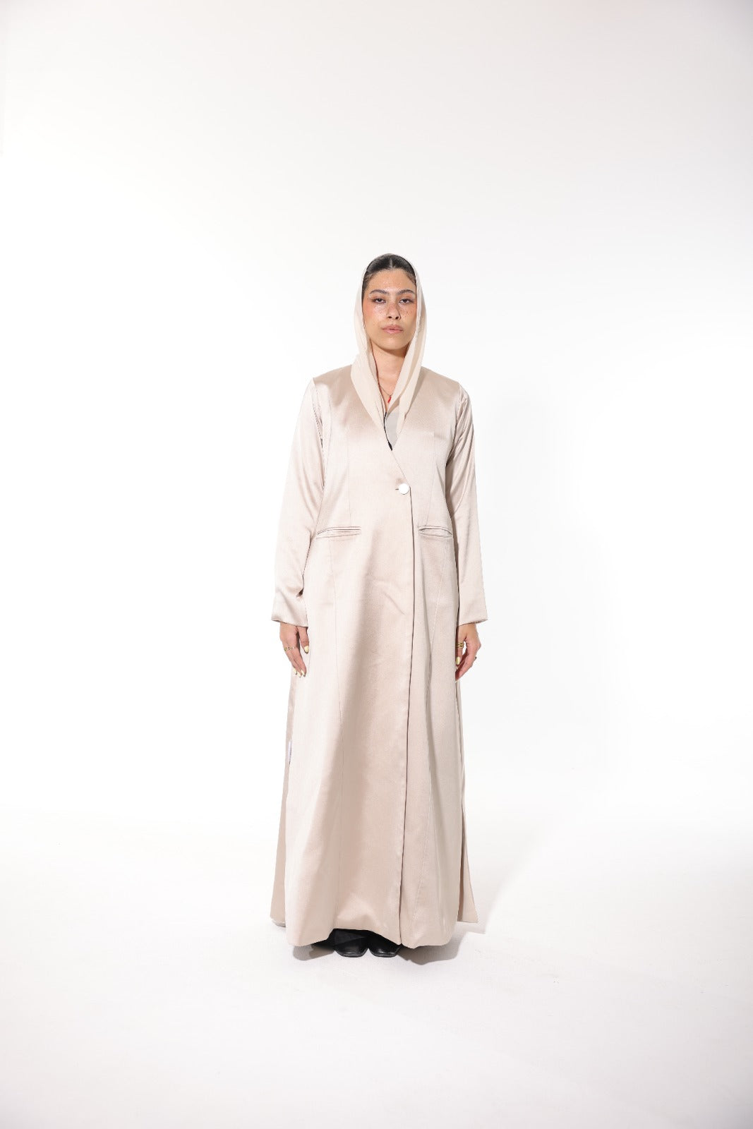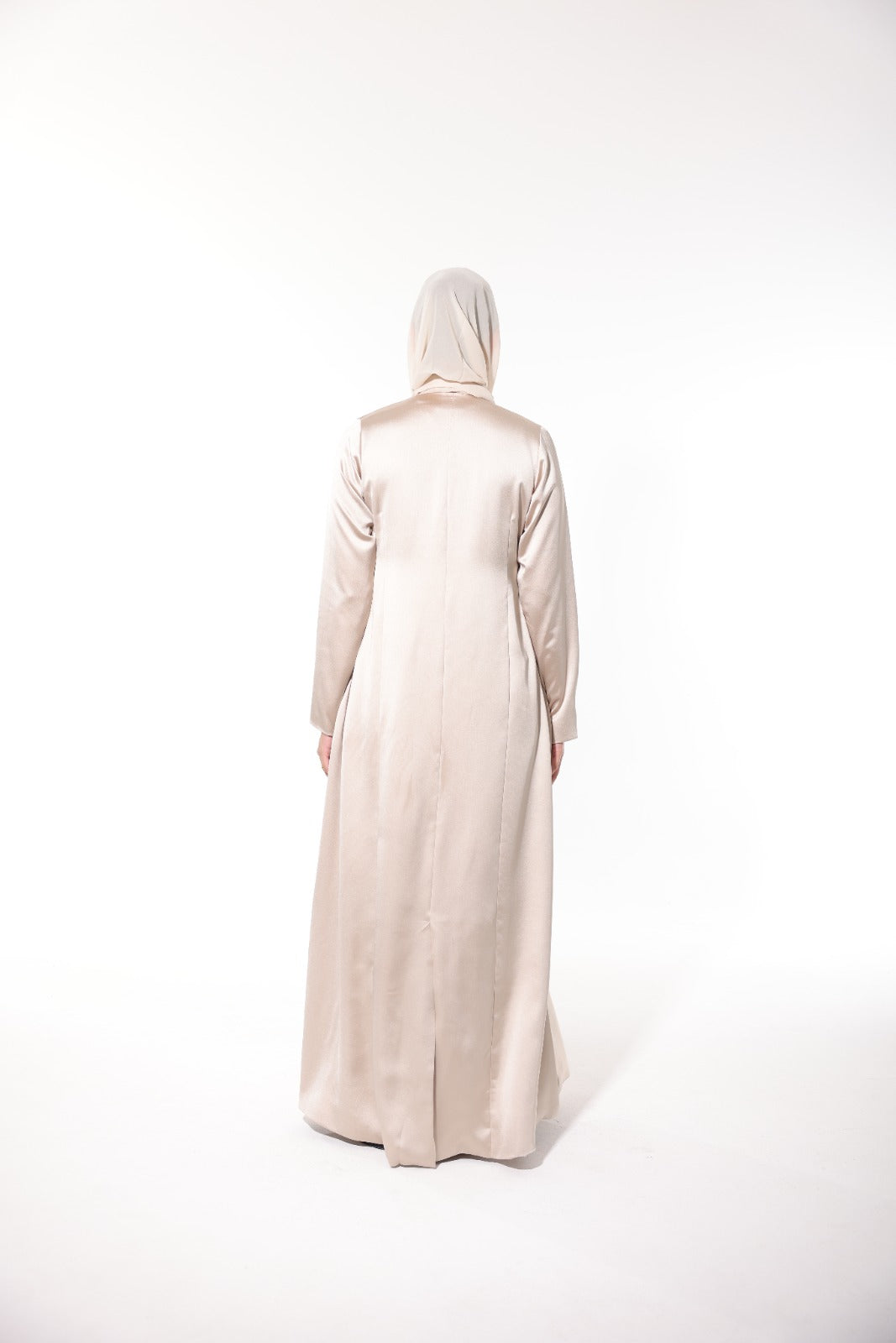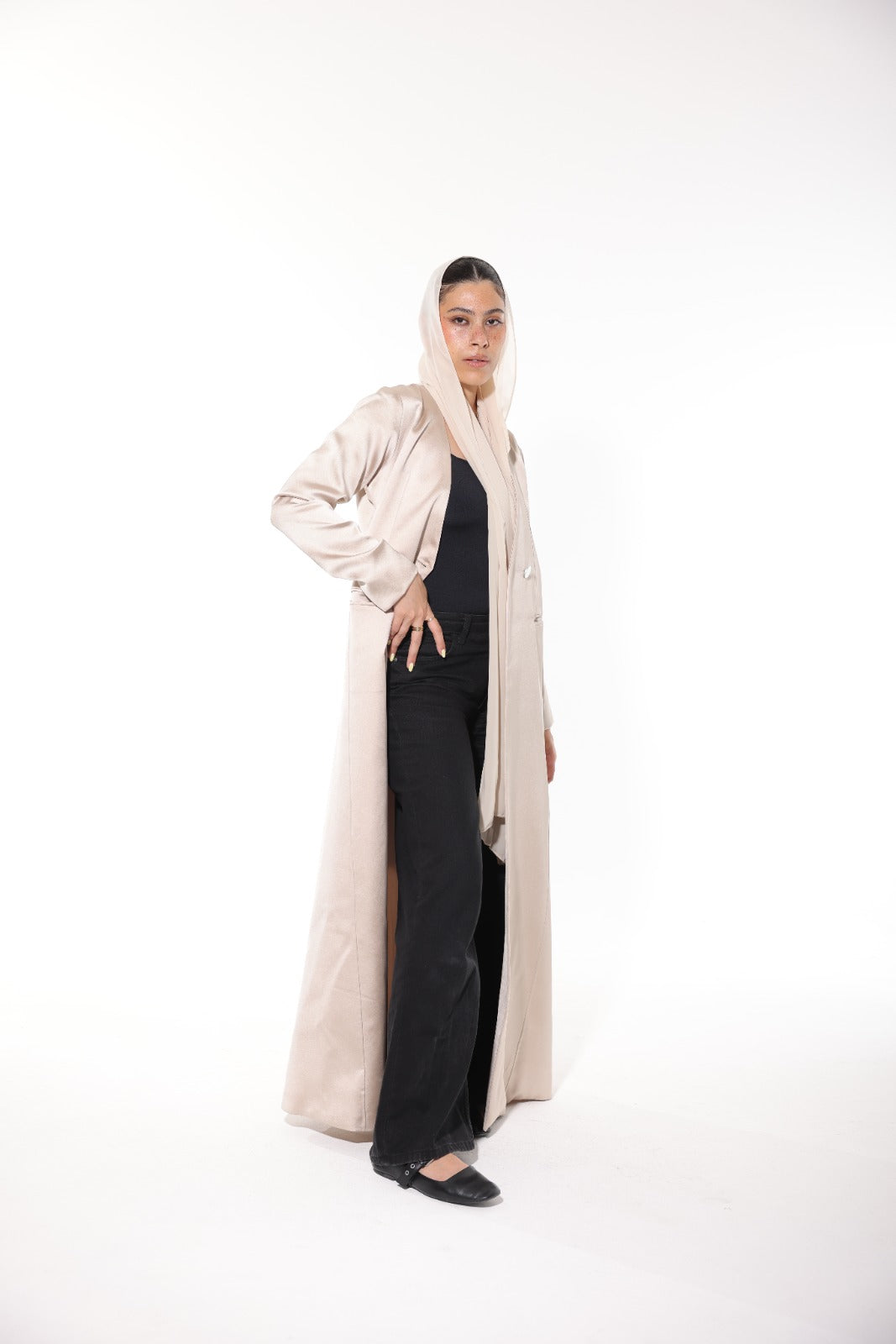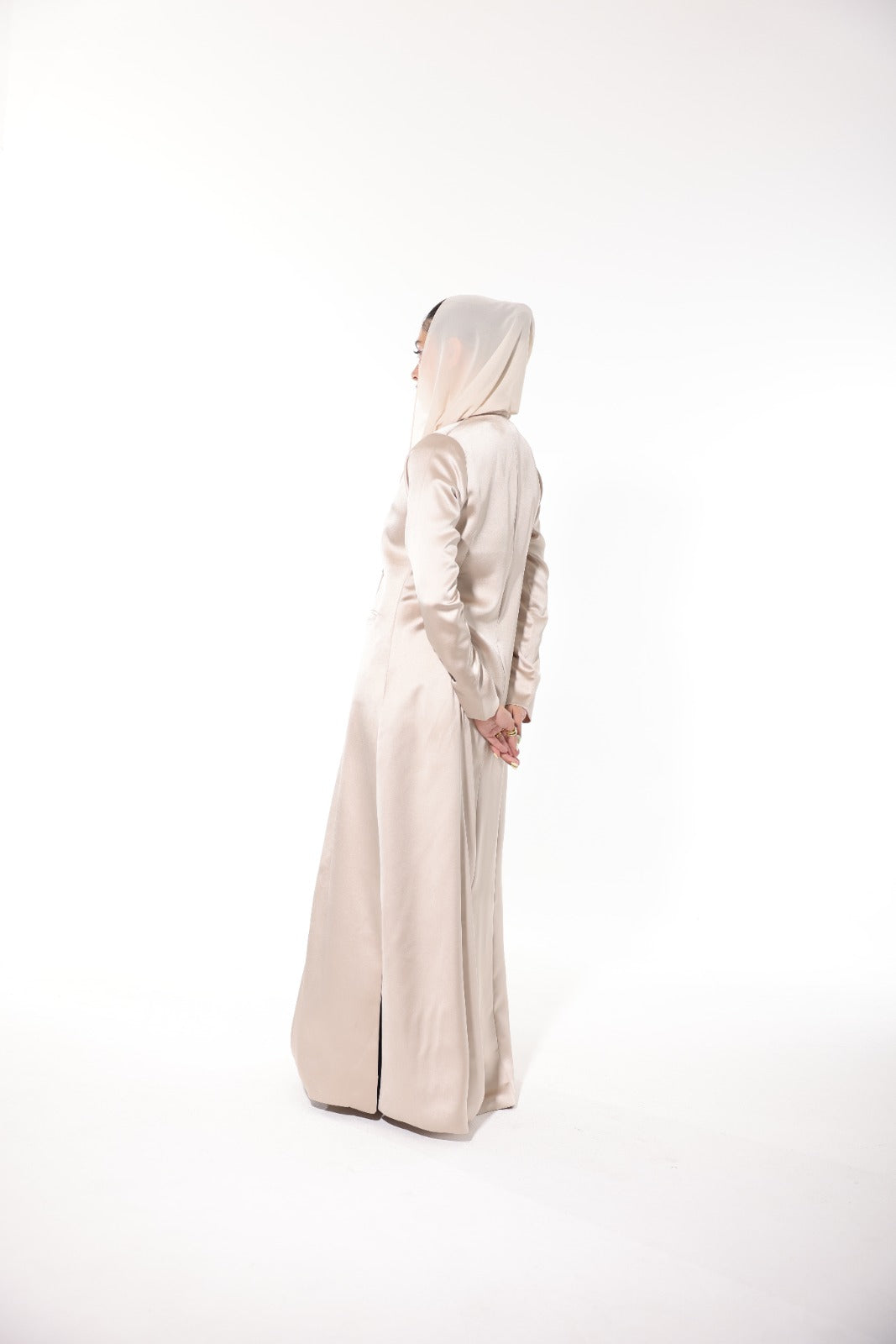 Crafted from Italian silk, this abaya features a soft light beige tone that exudes refined elegance. The flowing silhouette, high collar, and long sleeves create a graceful sense of poise and modesty. Finished with a signature silver AHF button at the center, it blends timeless tradition with modern sophistication. Set against a clean white backdrop, its look is both subtle and striking.