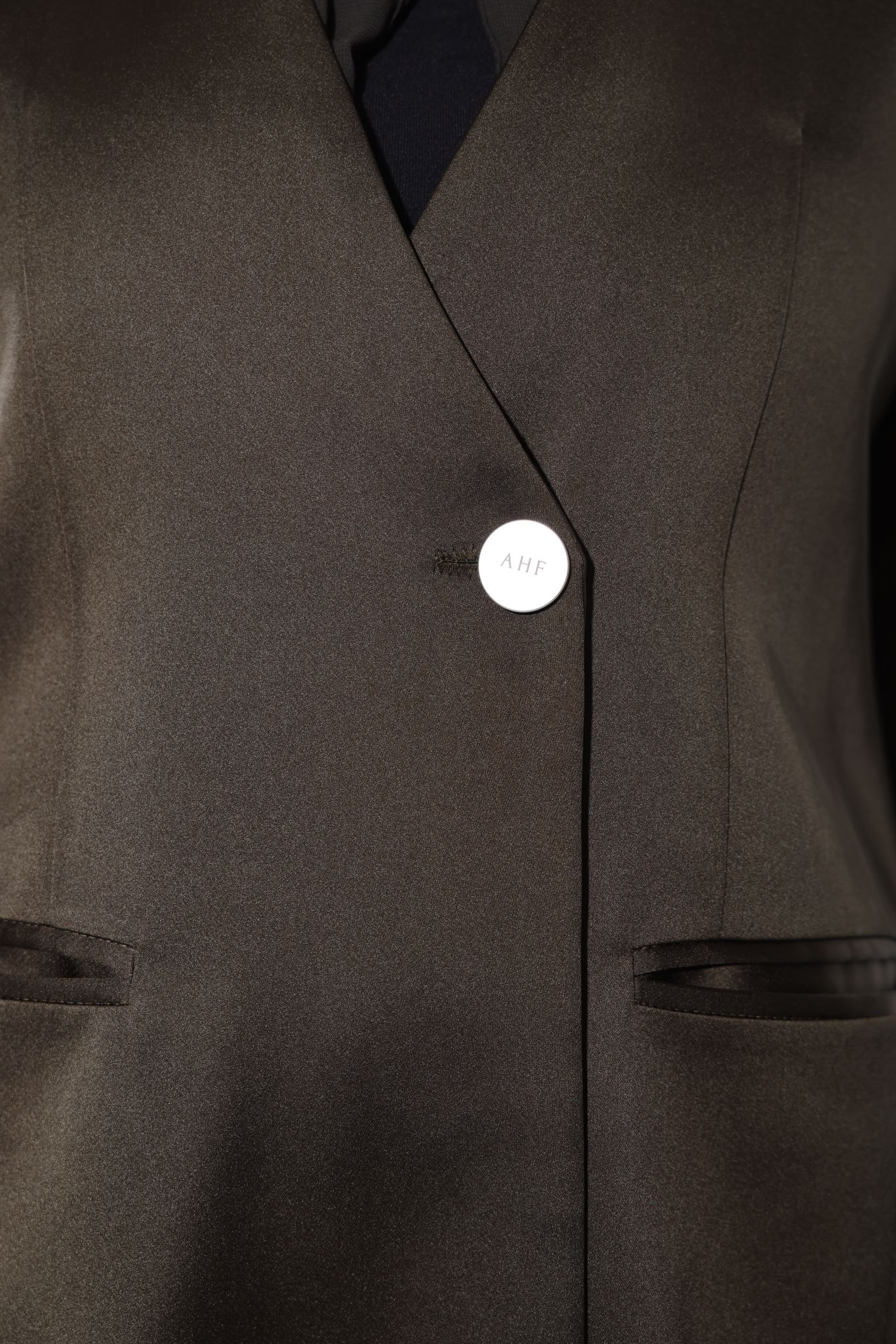 Crafted from Italian silk, this abaya showcases a deep olive green tone that exudes natural elegance.The fluid silhouette, high collar, and long sleeves create a graceful sense of poise. Finished with a silver button-down closure engraved with AHF, it blends timeless modesty with contemporary refinement.Set against a clean white backdrop, its presence is both bold and serene.