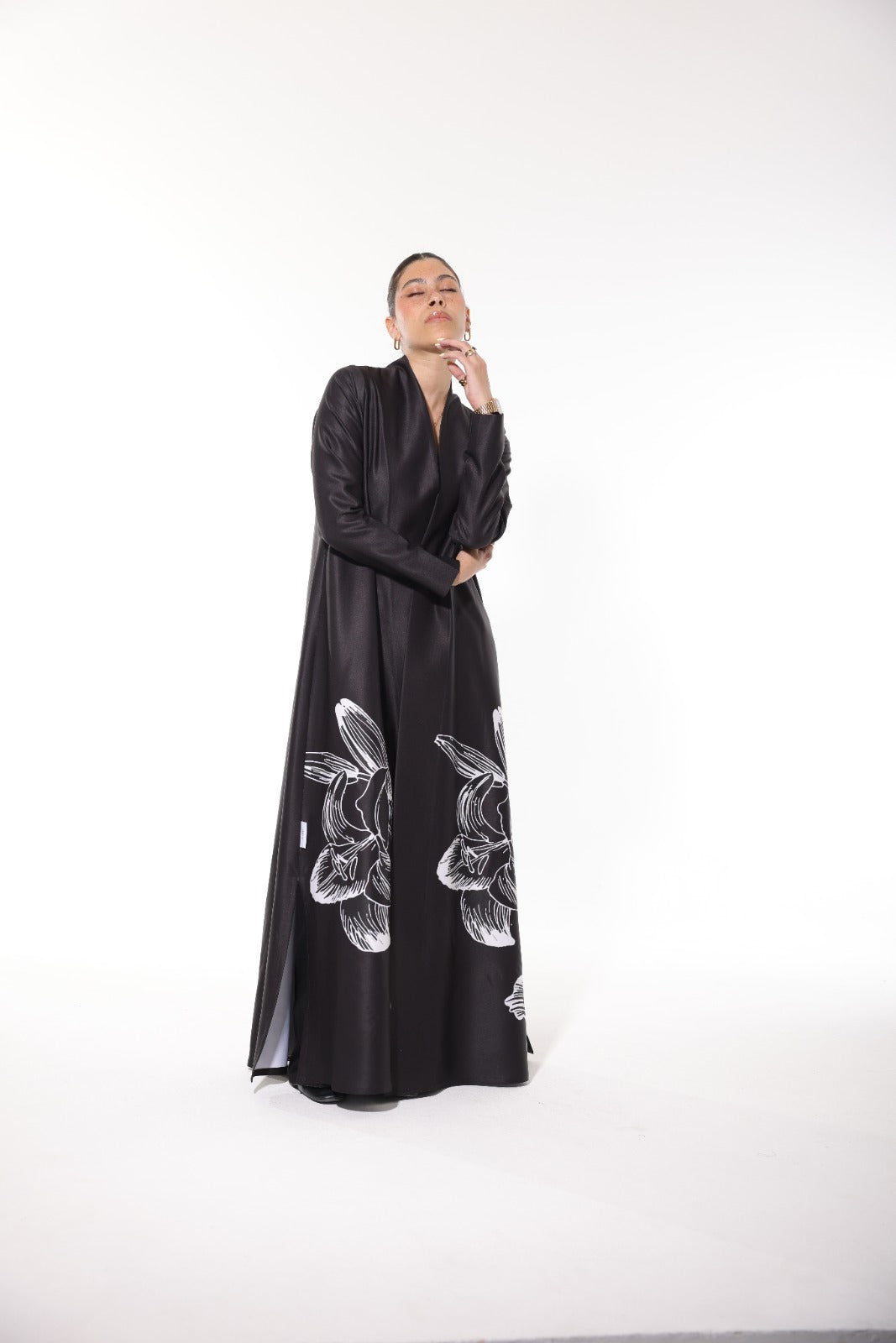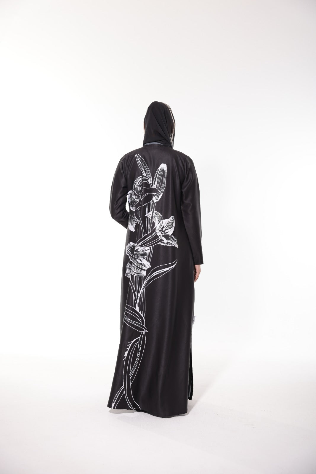 Noir bloom is striking black abaya white floral prints of crepe reminiscent of moonlit lilies, delicately blooming across the lower half and the accompanying sheila offering a blend of contemporary minimalism and timeless elegance. The contrast between the dark base and the bold botanical print creates a statement look, ideal for evening events or fashion-forward everyday wear.