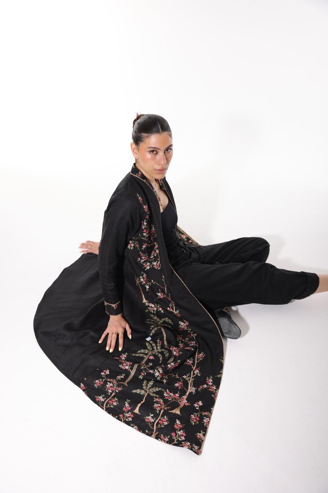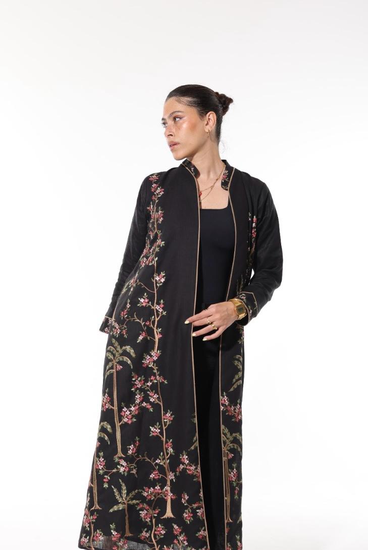 Crafted from linen, the palm abaya blends comfort with elegance. Adorned with intricate floral embroidery and delicate palms branches in shades of crimson, rose, and emerald green all gracefully outlined in beige this piece is a tribute to nature’s beauty. The soft beige trim along the sleeves and neckline adds a refined touch, making it a timeless piece of modest fashion.