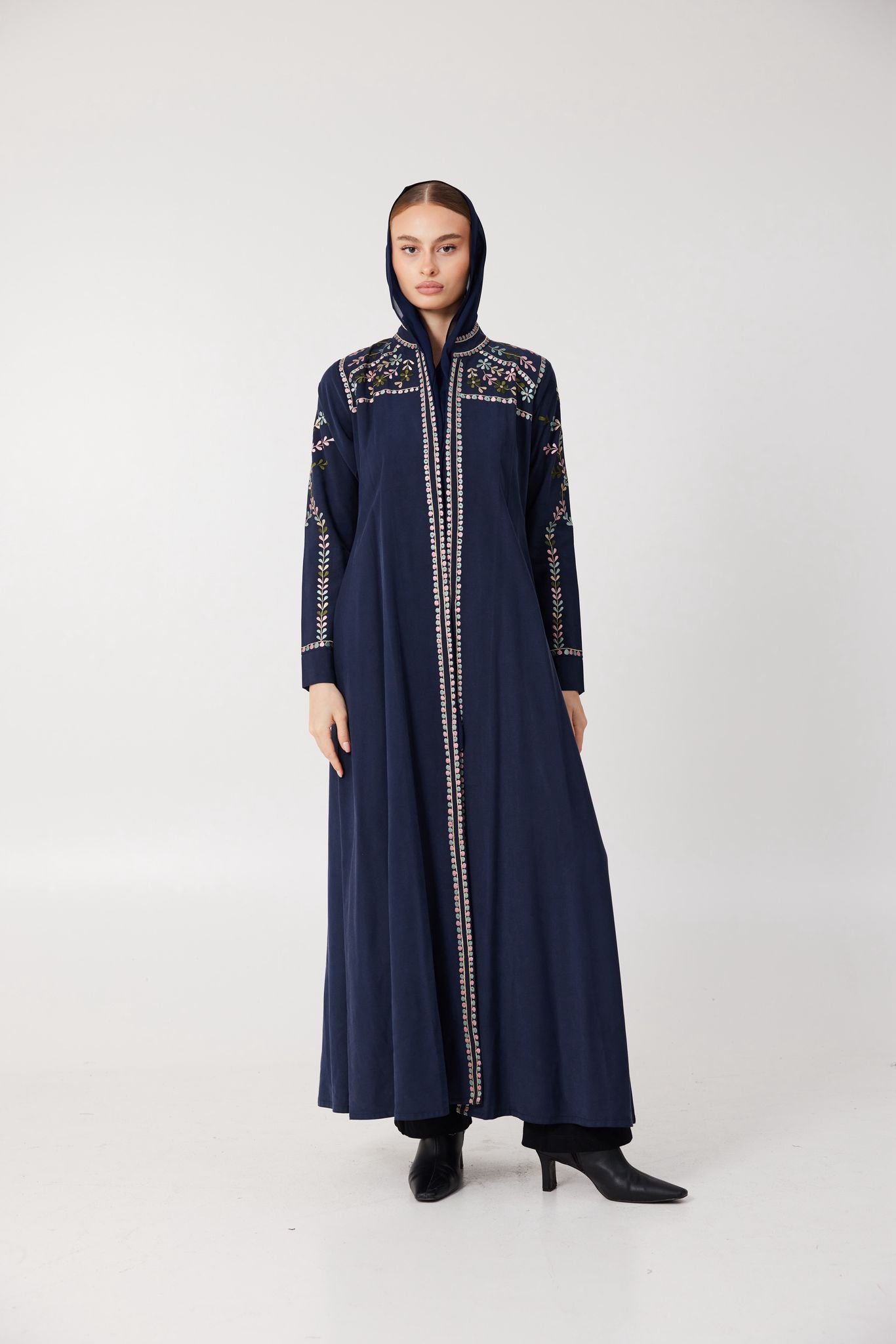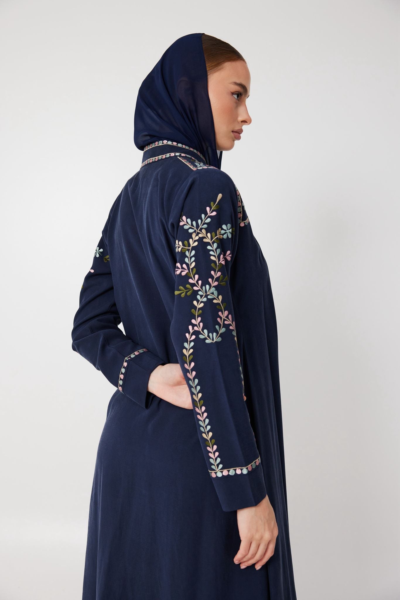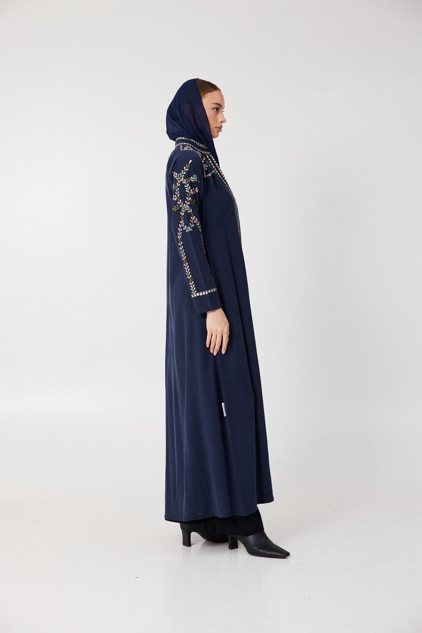 Deep navy velvet flows effortlessly in this timeless piece, detailed with delicate floral embroidery. Elegant, composed, and slightly untamed — Lune Sauvage is made for evenings that call for subtle strength and beauty.