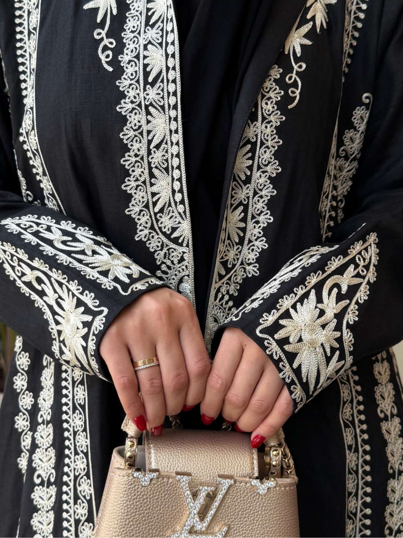 Threads of grace is a poetic name that highlights the beauty of hand embroidery and modest elegance. Crafted from linen, it’s a timeless black abaya adorned with intricate hand embroidery in soft ivory threads. Each floral and geometric motif is delicately stitched, celebrating traditional artistry with a modern touch. The detailed embroidery along the front panels and cuffs gives this piece a refined elegance, making it perfect for both everyday grace and special gatherings.